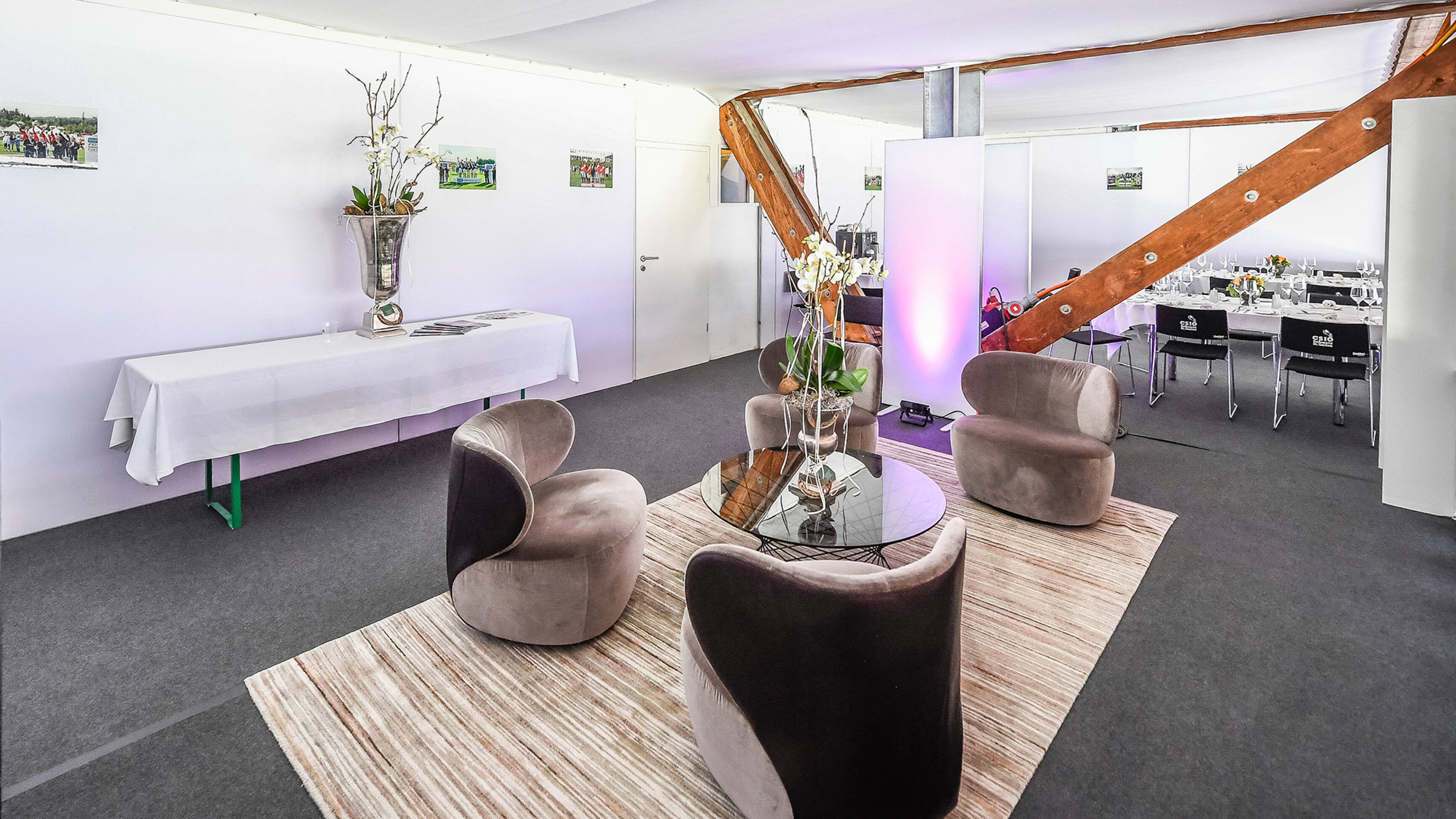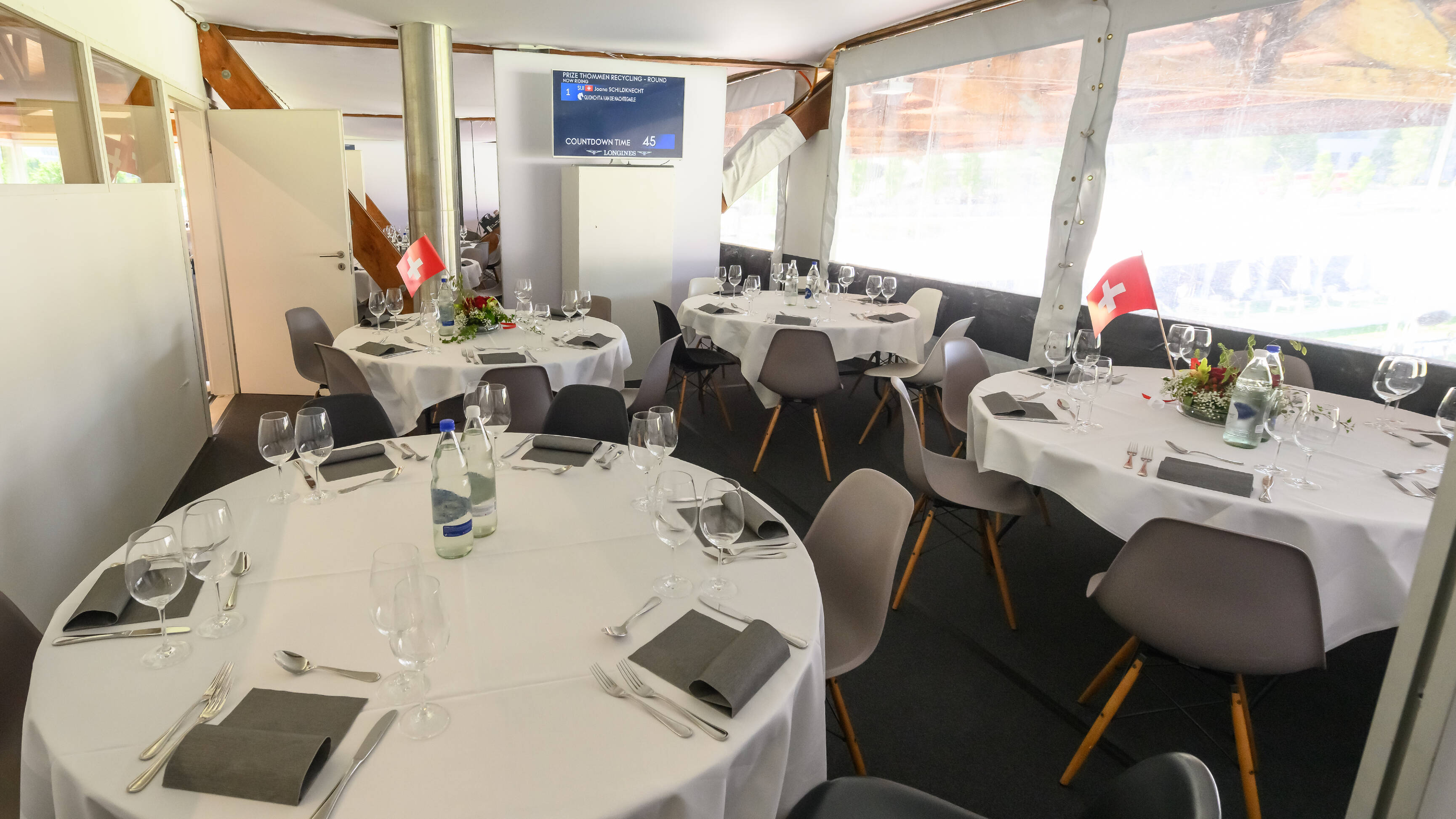 - Standard-Setting mit zwei Tischen für je acht Personen sowie Stehtischen.