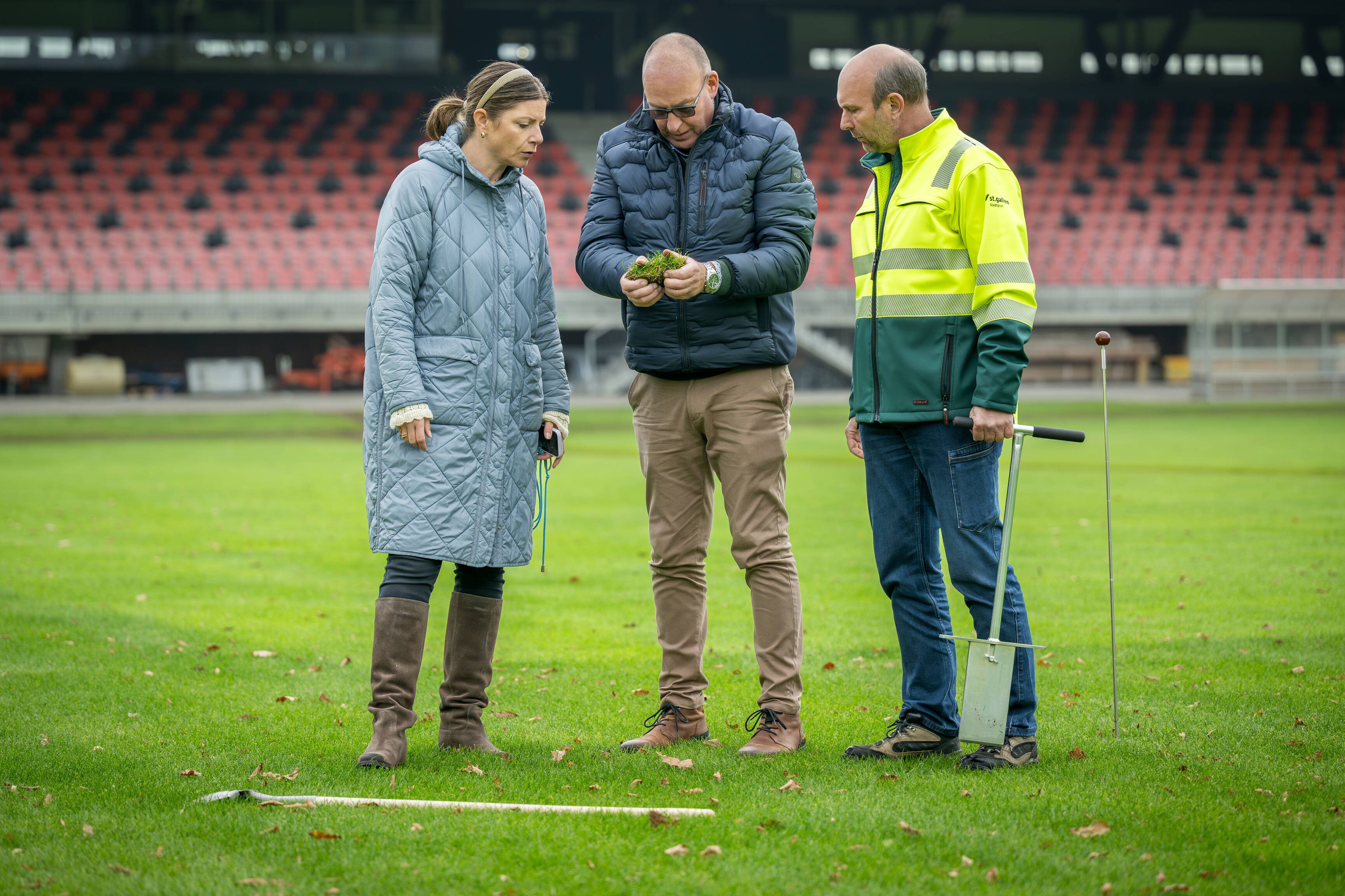 Kürzlich besuchte Michel Poncelet das Gründenmoos für eine aktuelle Inspektion und traf sich dabei mit Martin Streit, dem neuen Leiter öffentliche Anlagen der Stadt St. Gallen, und OK-Präsidentin Nayla Stössel. Martin Streit bringt jahrelange Expertise im Umgang mit Rasenplätzen mit. Bei dieser Gelegenheit wurden erneut Bodenproben für eine fundierte Analyse entnommen sowie die weiteren Massnahmen besprochen und in die Wege geleitet. OK-Präsidentin Nayla Stössel ist überzeugt: «Die Zusammenarbeit zwischen der Stadt St. Gallen als Eigentümerin, dem beigezogenen Experten und uns als Turnierorganisatoren funktioniert hervorragend. Gemeinsam werden wir für das Turnier 2026 eine weitere markante Verbesserung der Bodenqualität erreichen.»